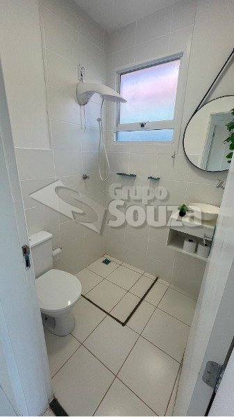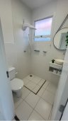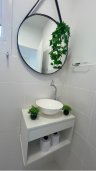 - Banheiro com chuveiro, espelho e gabinete